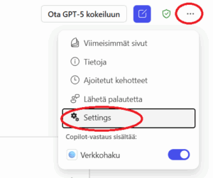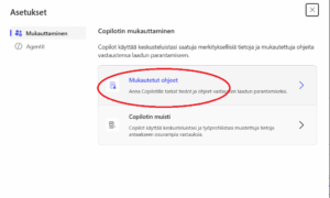 – Copilot: Klikkaan oikeasta yläkulmasta kolmea pistettä, valitsen Settings → Mukautetut ohjeet ja liitän saamani ohjetekstin.